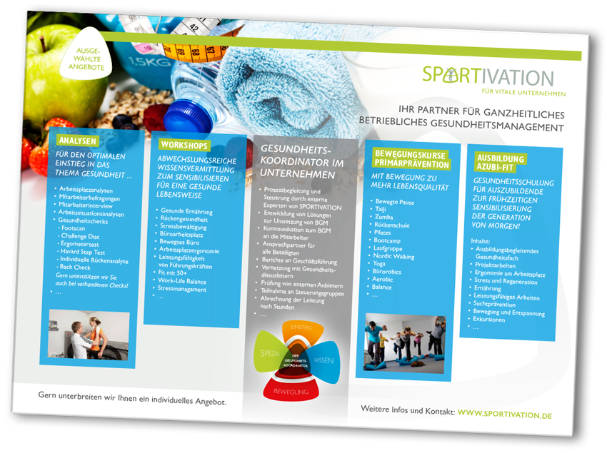 SPORTIVATION interveniert auf verschiedenen Ebenen. Auf Individueller und Gruppenebene werden schon einige Menschen durch direkte Maßnahmen erreicht. Die an den Angeboten teilnehmenden Mitarbeiter werden immer Kompetenzen auf gesundheitsförderlicher Ebene im Bereich Bewegung und Entspannung gestärkt. Die verschiedenen Kursleiter leiten die Einheiten so an, dass ein nachhaltiger Gesundheitsgewinn daraus resultieren soll. Mit Erfahrungen im Kurs, Hinweise zu Übungen im Arbeitsalltag, sowie praktischen Tipps für zuhause werden die Teilnehmer zum gesundheitsorientiertesten Umdenken und Handeln angeregt. Durch diese bottom-up Strategie wird zunächst noch kein ganzheitliches Gesundheitsmanagement umgesetzt. Dies soll nachhaltig „von innen heraus“ entstehen, denn wenn die Mitarbeiter überzeugt an den Programmen teilnehmen, entwickelt sich auch eine Struktur dafür im Unternehmen.