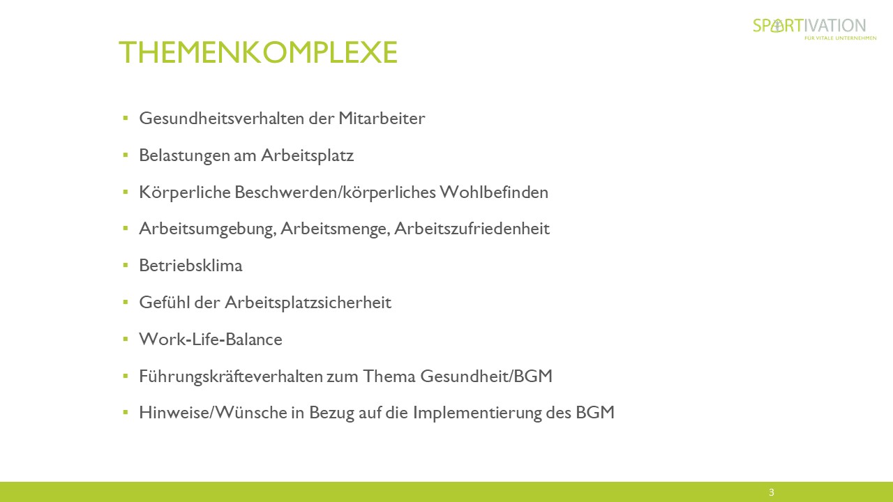- Fragen zur physischen und psychischen Gesundheit, zu Lebensstil und Ernährung, belastenden Tätigkeiten, existierenden Beschwerden, eigenem Bewegungsverhalten